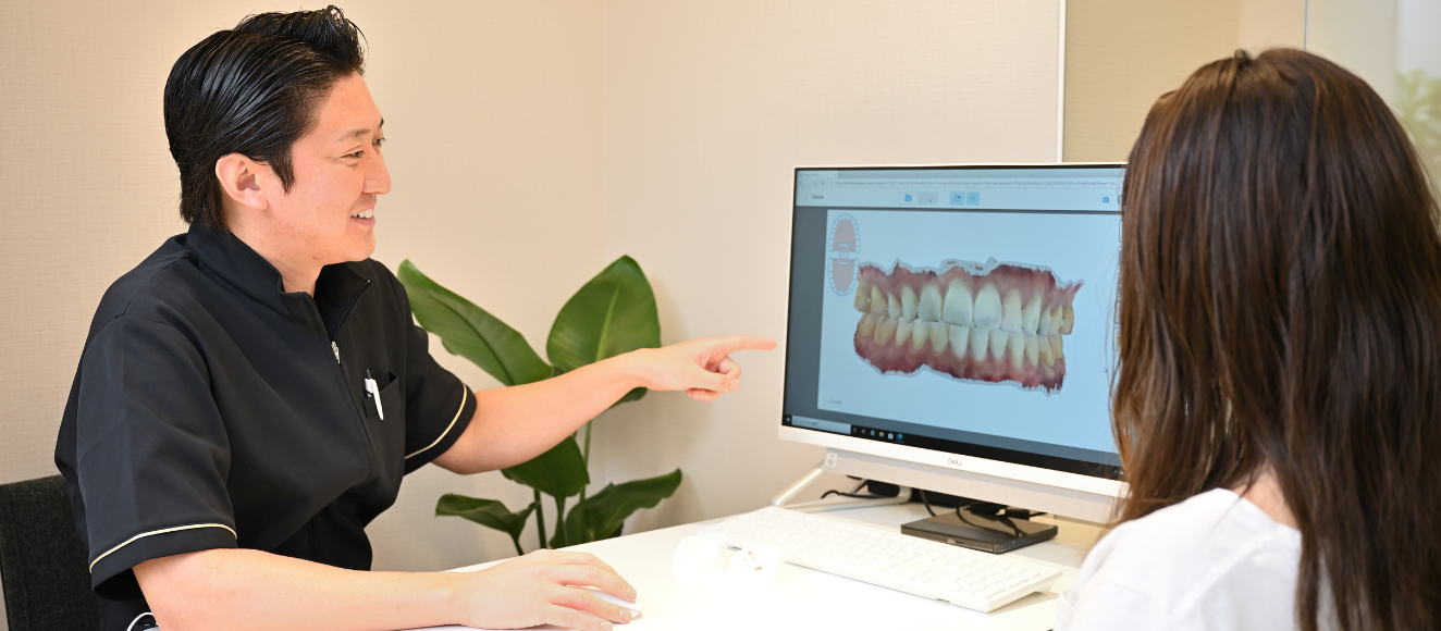 まずは患者さまがどのようなお悩みを持って受診されたのかをしっかりお伺いします。その後患者さまの口腔内を視診し、口腔内スキャナーを用いてモニター上で患者さまの歯並びの状態、治療完了後の歯並びを3Dで確認します。